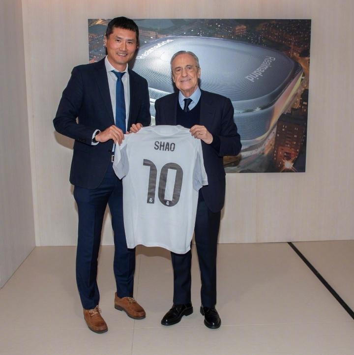 不仅如此,邵佳一还与皇马主席弗洛伦蒂诺微笑合影,并且获赠了一件印有邵佳一英文缩写的皇马10号球衣。